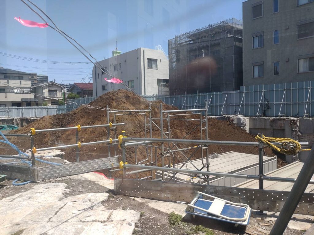 2025/5/7 現在、外周部を残して、地下1階の床は掘り返されて、残土が積み上がっている。
