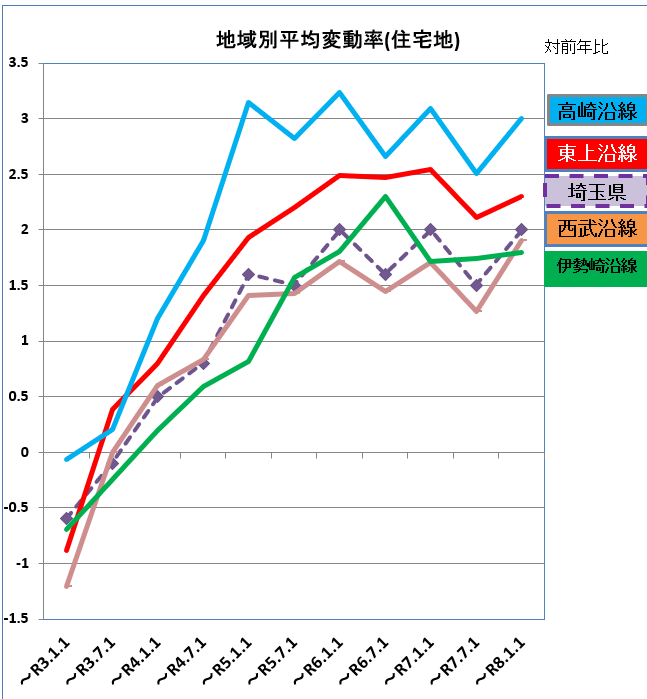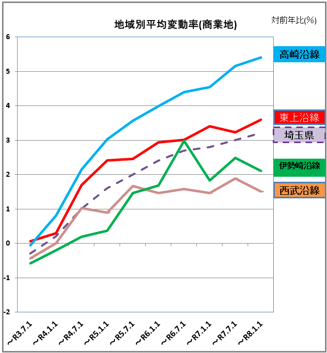 埼玉県の価格は今期もプラス上昇、住宅地は毎年2%前後の上昇を示し、商業地は住宅地を上回るプラスを続けている。