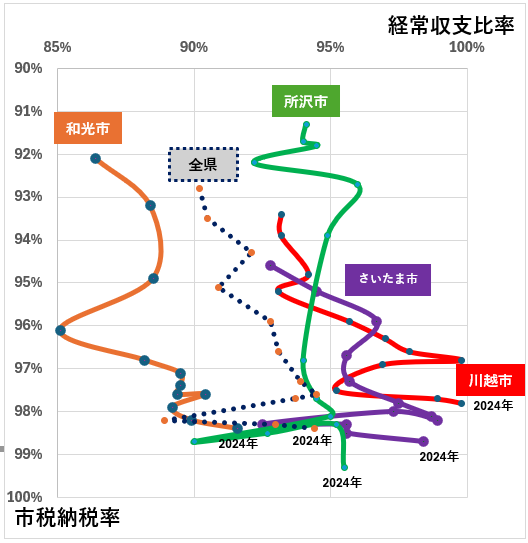 川越市の経常収支比率は99.8%。ほぼ100%だ。東京に近く人気の高い和光市は92%、埼玉県内全市町村の平均は95.1%、所沢市は95.5%だ。川越市同様厳しいと言えるさいたま市でも98.5%。川越市は県内のワーストワンだ。