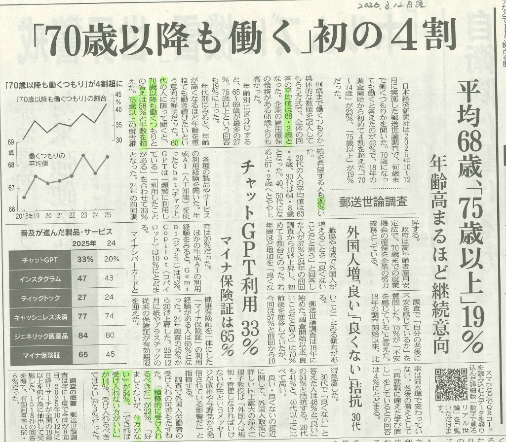日経新聞記事によると、「何歳まで働く?」の問いに対する回答平均値は68.3才だという。